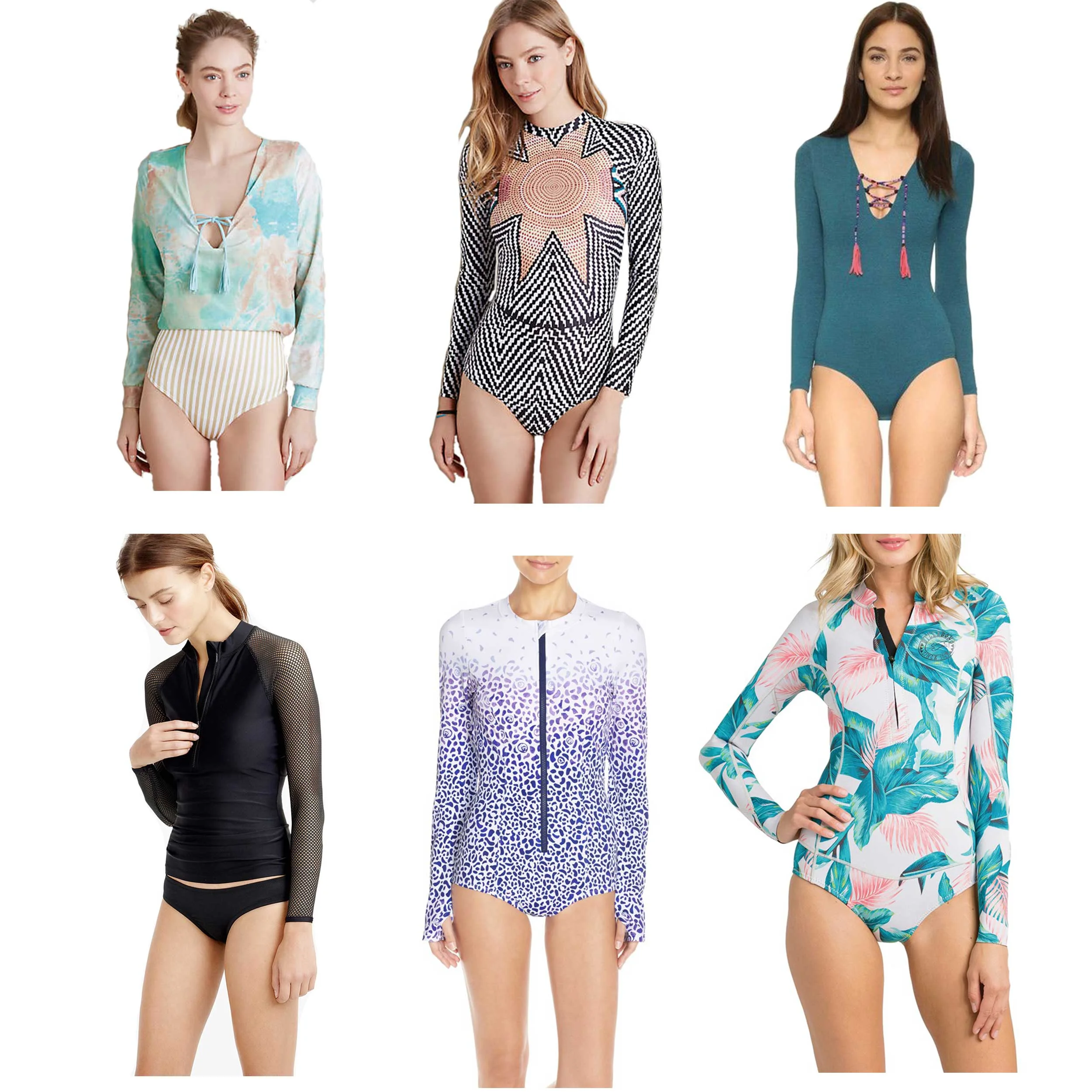 I probably won’t be spending much time laying out sun bathing. But, I can’t avoid the beach or pool all together. I mean, Xan and I already have a vacation planned to Southern California with his family. And while I can choose not to tan on the beach I do want to take surfing lessons, go sea-kayaking, stand-up paddle boarding, and participate in lots of other fun water sports. For me, the hours on the water that those things require is a sunburn waiting to happen. Both because you’re directly on the water for so long and because it’s hard to keep sunscreen on while being active. That’s why I’ve set out on the hunt for a cute, long-sleeved, sun protecting bathing suit. I will of course still use sunscreen. But, with long sleeves and a crew neck I can protect my shoulders, chest, and back, which are some of the areas I get burned the worst.