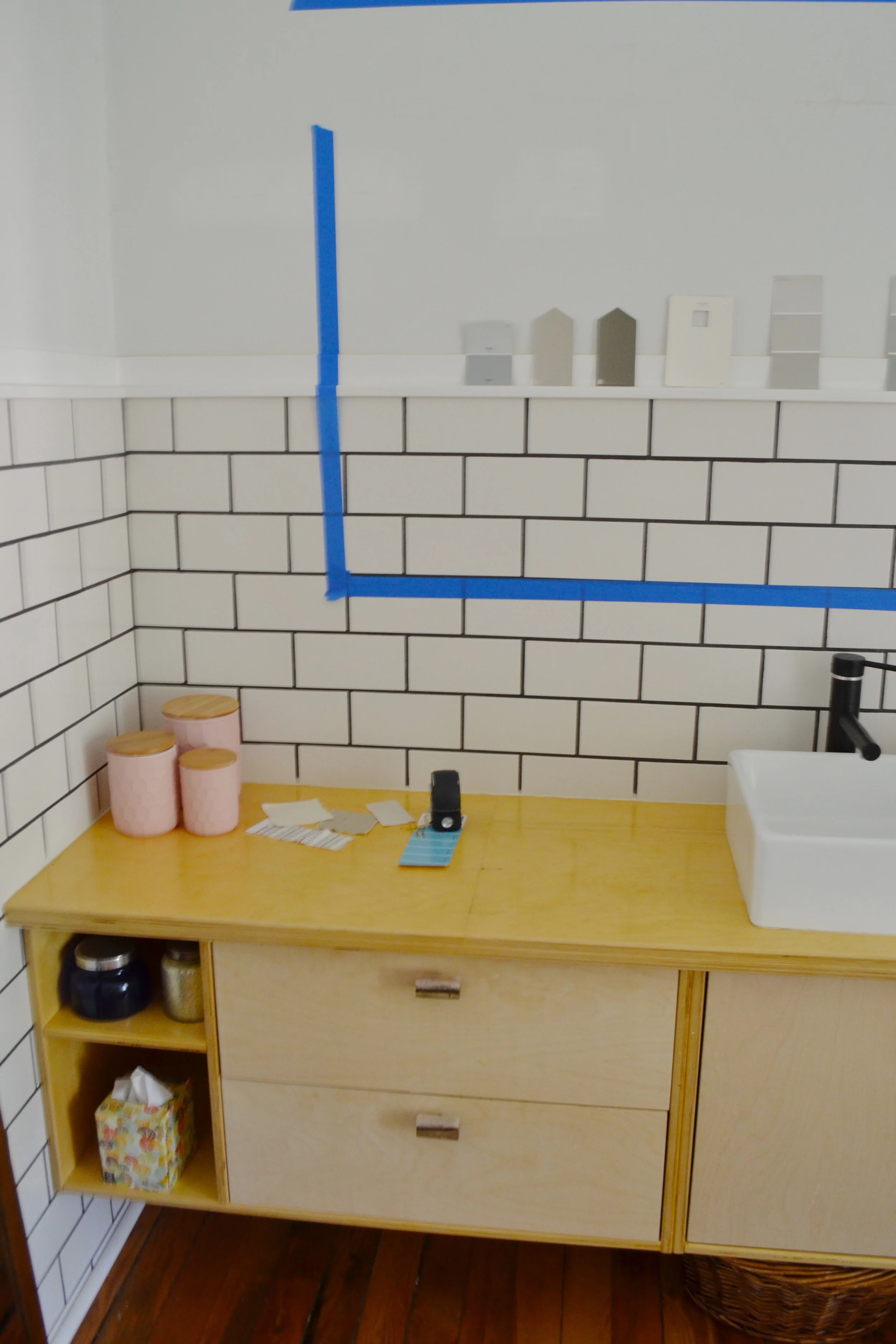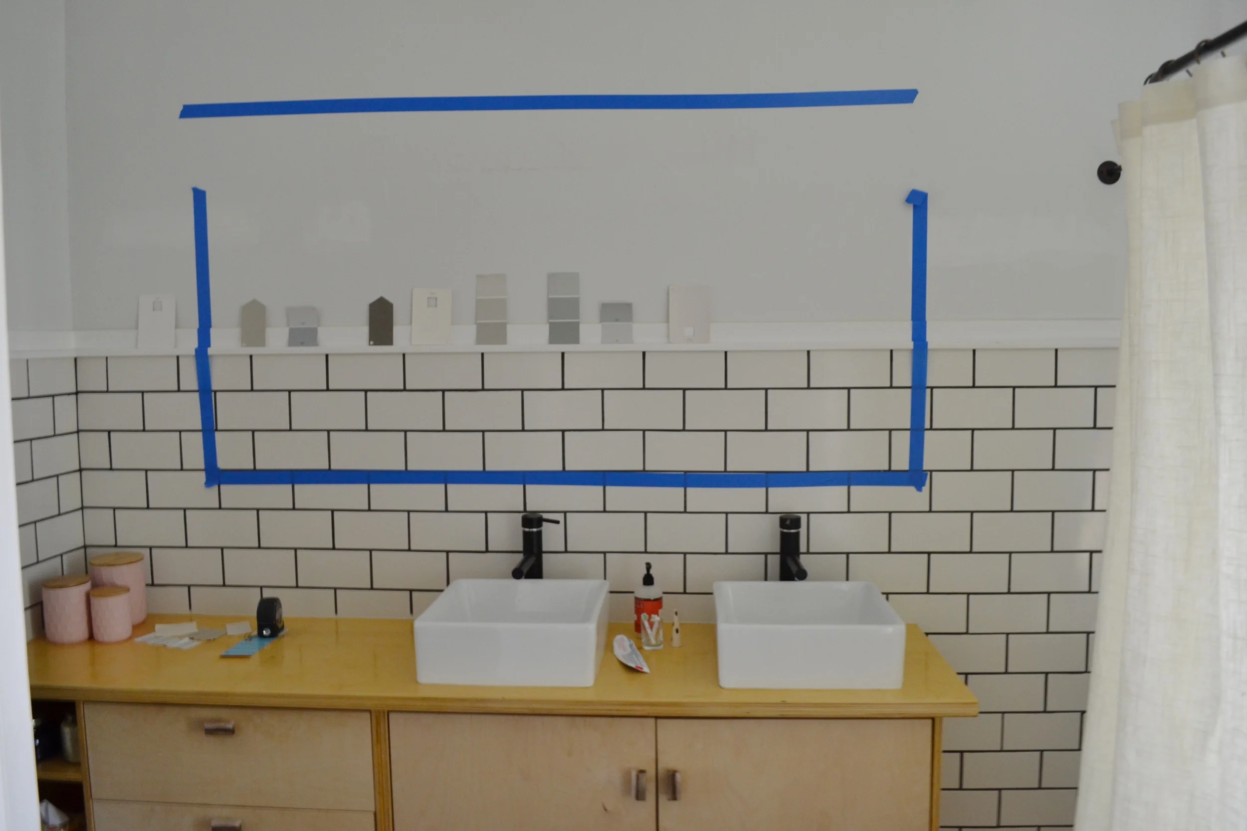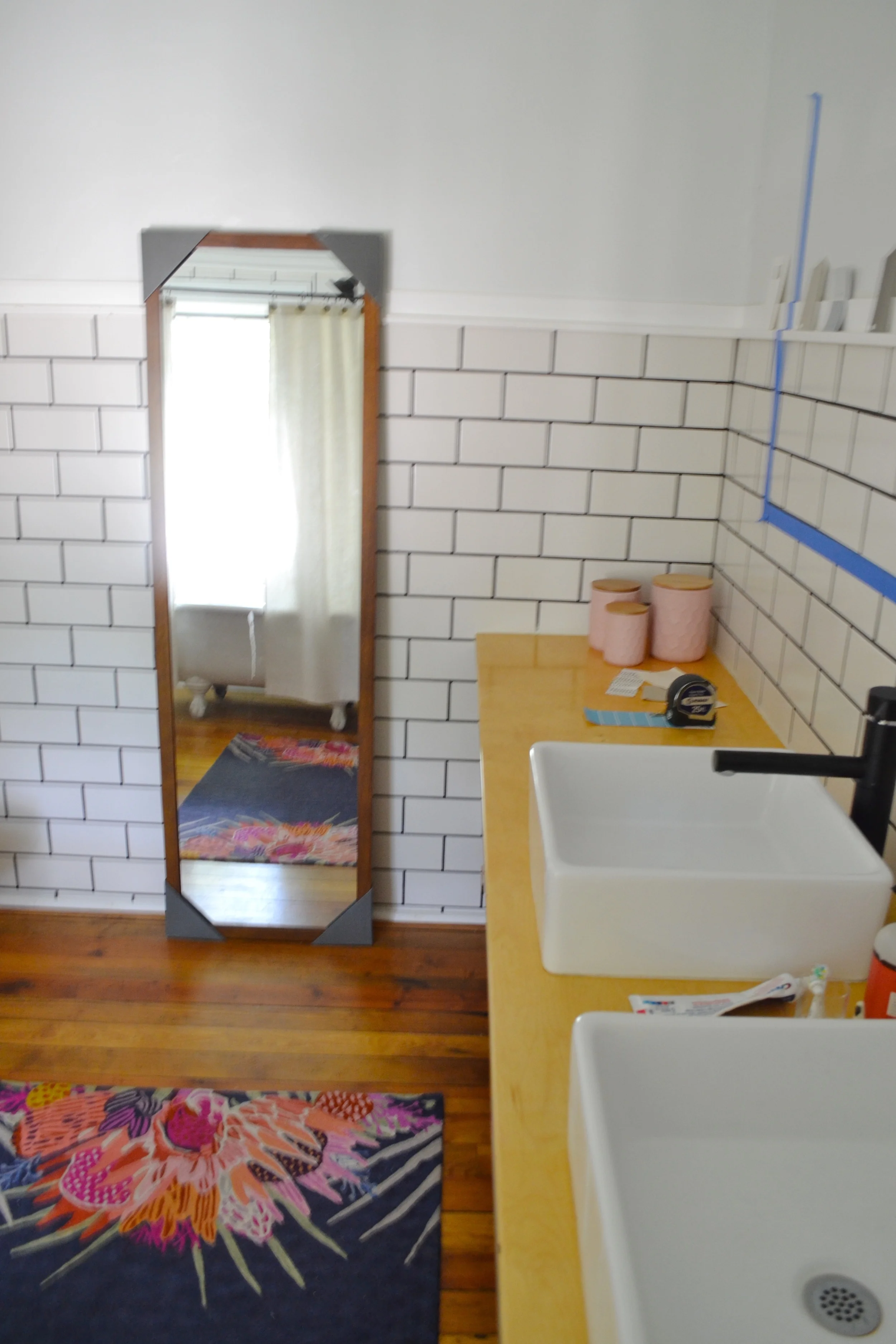 Really all I wanted to do was add a mirror and paint the walls. Both simple things right?? Well, not quite. I’ll start with the mirror. The biggest mirror I’ve been able to find is 30” x 40” (roughly) and that’s just not big enough. The whole vanity is 85” and I wanted something that spanned almost all of it. I thought about settling for one of those 30” x 40” options, but the sinks measure 45” and I think it will just look weird to put a mirror up that isn’t at least as wide as the sinks. Then you would stand at a sink, look in the mirror and part of you would be cut off. No, I wasn’t into it. Unfortunately the sinks are too close together to put a mirror above each one. If I wanted to do that and keep them from touching each other they would end up having to be really tiny. Then it thought about getting a floor mirror and mounting on the wall sideways. I found one at the West Elm outlet that I really loved, but it was so heavy. Like wayyyy too heavy for our plaster walls to support so that was out. And all the other ones I looked at were either too expensive or I just didn’t like them. So, we decided we would just see what a custom mirror would cost. I assumed that it would be crazy expensive, but it was actually really cheap. Now, it’s just the mirror no frame or anything, but we’re pretty sure we can add something. All we have to do is figure out the size. Well this is where the painting thing comes in. You can’t tell from these pictures, but right below the piece of painters tape on the top of the wall is very uneven. It looks like maybe there was something mounted there at some point and then was taken off. It’s really bumpy and weird looking. It’s about 2.5’ wide and 6” tall. Plus there are some other uneven spots around the room. So I was just going to sand everything really well and then give it a nice coat of paint. Welllll, it occurred to me that since the house was built in 1910 there’s probably some lead paint in there somewhere and it’s not a great idea to sand it. So, we thought maybe we could make the mirror larger and cover the weird area. But, now the proportions seem off to me and I haven’t been able to pull the trigger. Where the tape on the sides stop is how tall we were planning on making the mirror which seemed really good. So I need to decide on the mirror height so I know what’s happening with the ugly spot on the wall so I can decide how to fix it or hide it so I can paint. Or wallpaper? I’ve been really wanting to wallpaper it lately because I feel like it needs another pattern in there. I love the rug that I got, but that’s the only color or pattern in the room and it’s on the floor. I feel like there needs to be something else to balance it out.