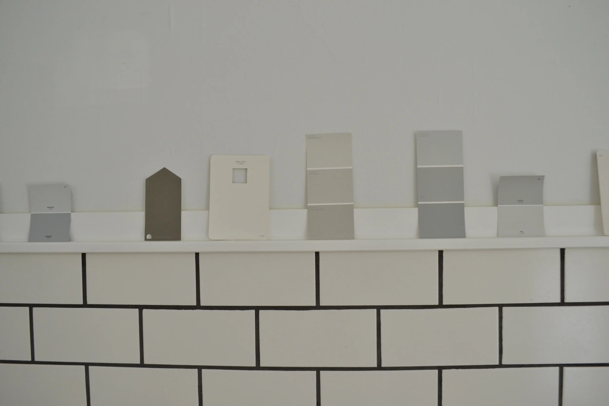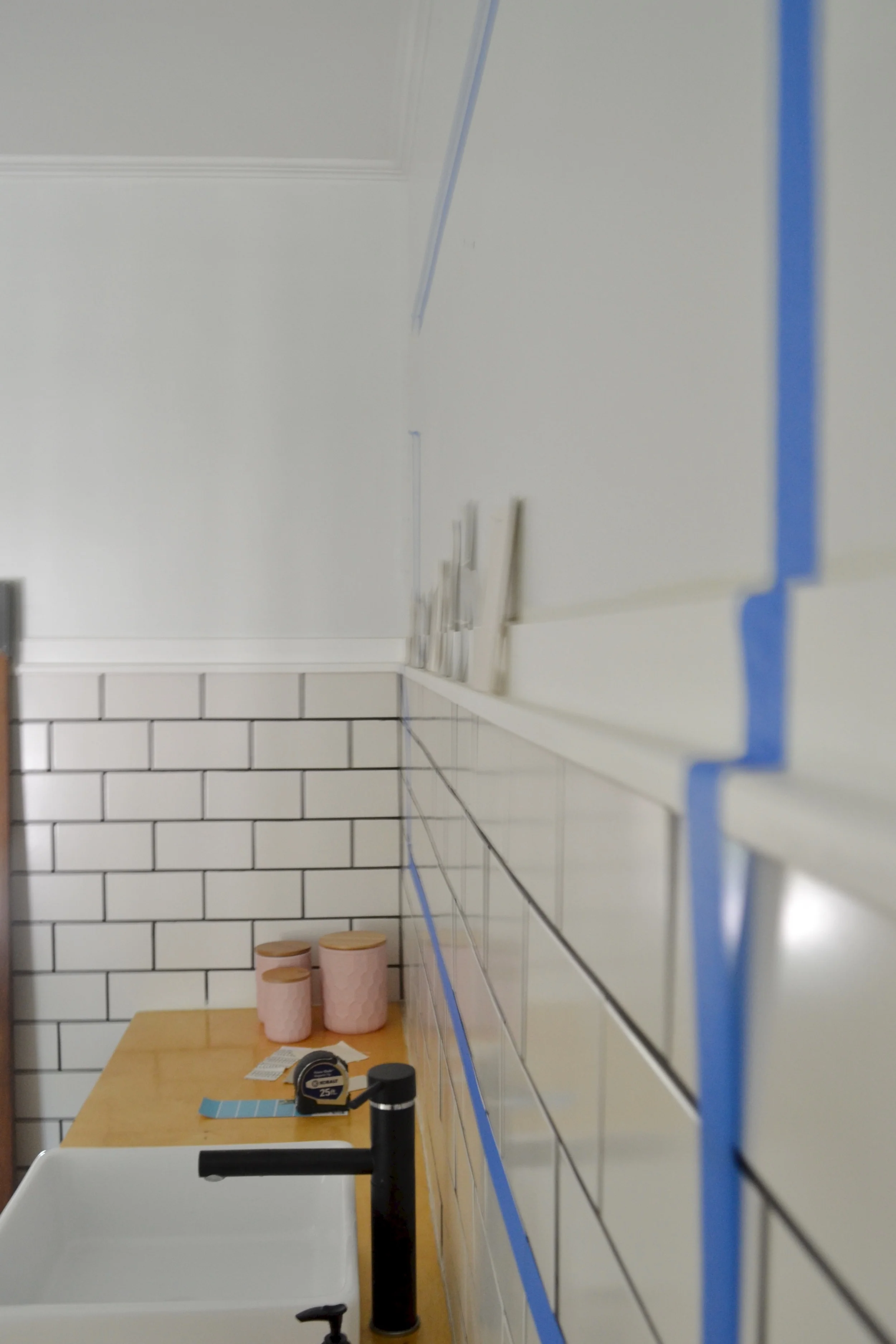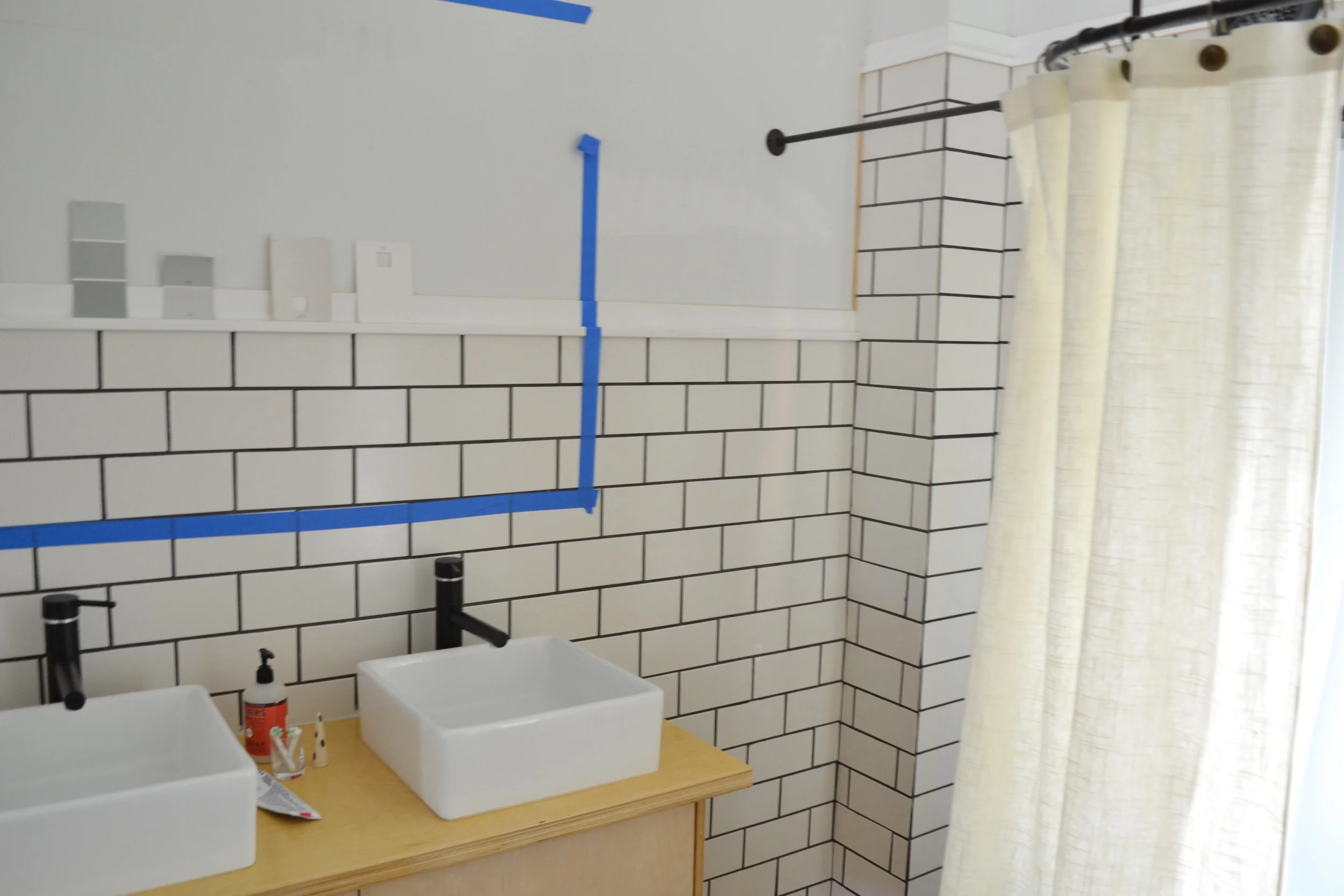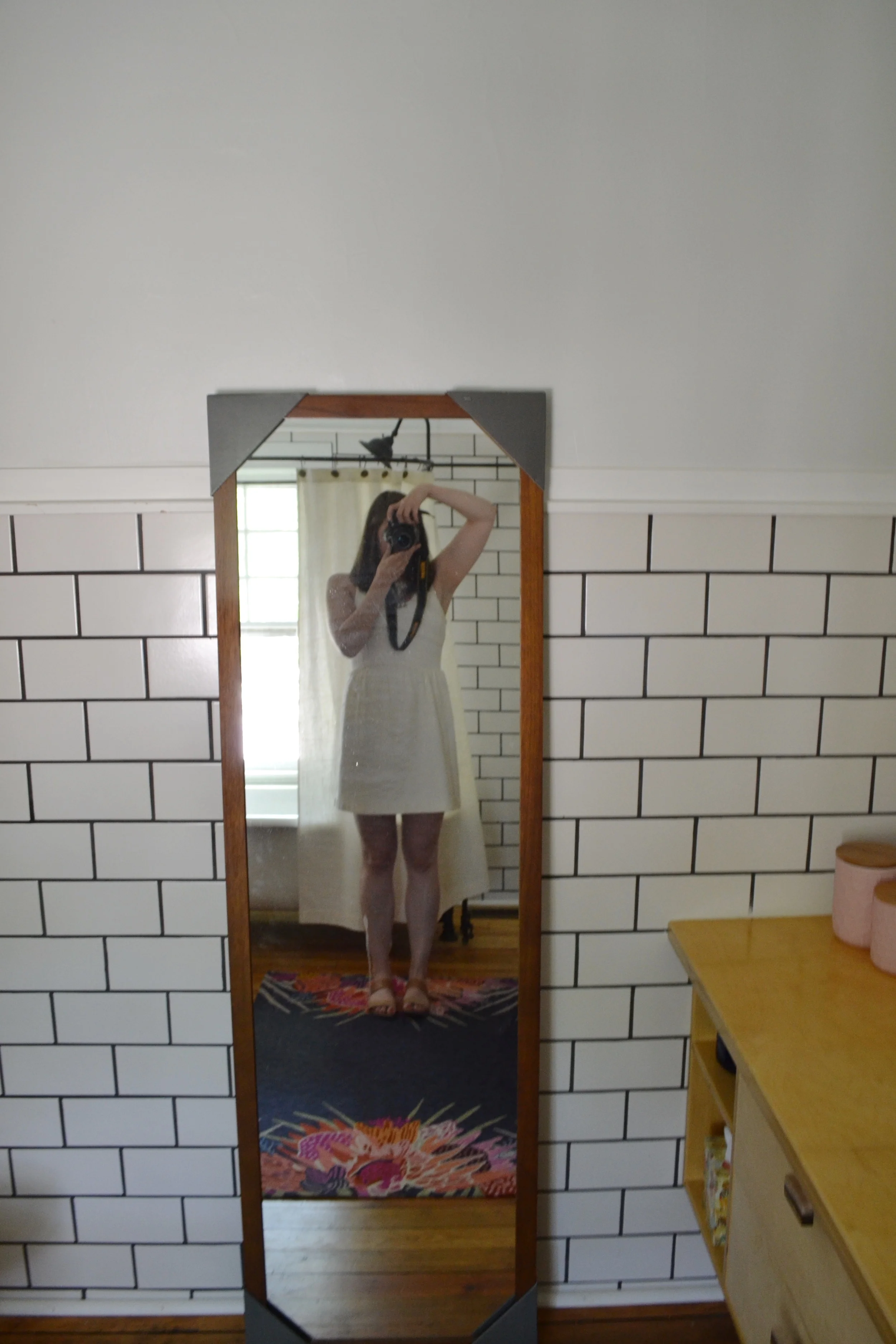 Really all I wanted to do was add a mirror and paint the walls. Both simple things right?? Well, not quite. I’ll start with the mirror. The biggest mirror I’ve been able to find is 30” x 40” (roughly) and that’s just not big enough. The whole vanity is 85” and I wanted something that spanned almost all of it. I thought about settling for one of those 30” x 40” options, but the sinks measure 45” and I think it will just look weird to put a mirror up that isn’t at least as wide as the sinks. Then you would stand at a sink, look in the mirror and part of you would be cut off. No, I wasn’t into it. Unfortunately the sinks are too close together to put a mirror above each one. If I wanted to do that and keep them from touching each other they would end up having to be really tiny. Then it thought about getting a floor mirror and mounting on the wall sideways. I found one at the West Elm outlet that I really loved, but it was so heavy. Like wayyyy too heavy for our plaster walls to support so that was out. And all the other ones I looked at were either too expensive or I just didn’t like them. So, we decided we would just see what a custom mirror would cost. I assumed that it would be crazy expensive, but it was actually really cheap. Now, it’s just the mirror no frame or anything, but we’re pretty sure we can add something. All we have to do is figure out the size. Well this is where the painting thing comes in. You can’t tell from these pictures, but right below the piece of painters tape on the top of the wall is very uneven. It looks like maybe there was something mounted there at some point and then was taken off. It’s really bumpy and weird looking. It’s about 2.5’ wide and 6” tall. Plus there are some other uneven spots around the room. So I was just going to sand everything really well and then give it a nice coat of paint. Welllll, it occurred to me that since the house was built in 1910 there’s probably some lead paint in there somewhere and it’s not a great idea to sand it. So, we thought maybe we could make the mirror larger and cover the weird area. But, now the proportions seem off to me and I haven’t been able to pull the trigger. Where the tape on the sides stop is how tall we were planning on making the mirror which seemed really good. So I need to decide on the mirror height so I know what’s happening with the ugly spot on the wall so I can decide how to fix it or hide it so I can paint. Or wallpaper? I’ve been really wanting to wallpaper it lately because I feel like it needs another pattern in there. I love the rug that I got, but that’s the only color or pattern in the room and it’s on the floor. I feel like there needs to be something else to balance it out.