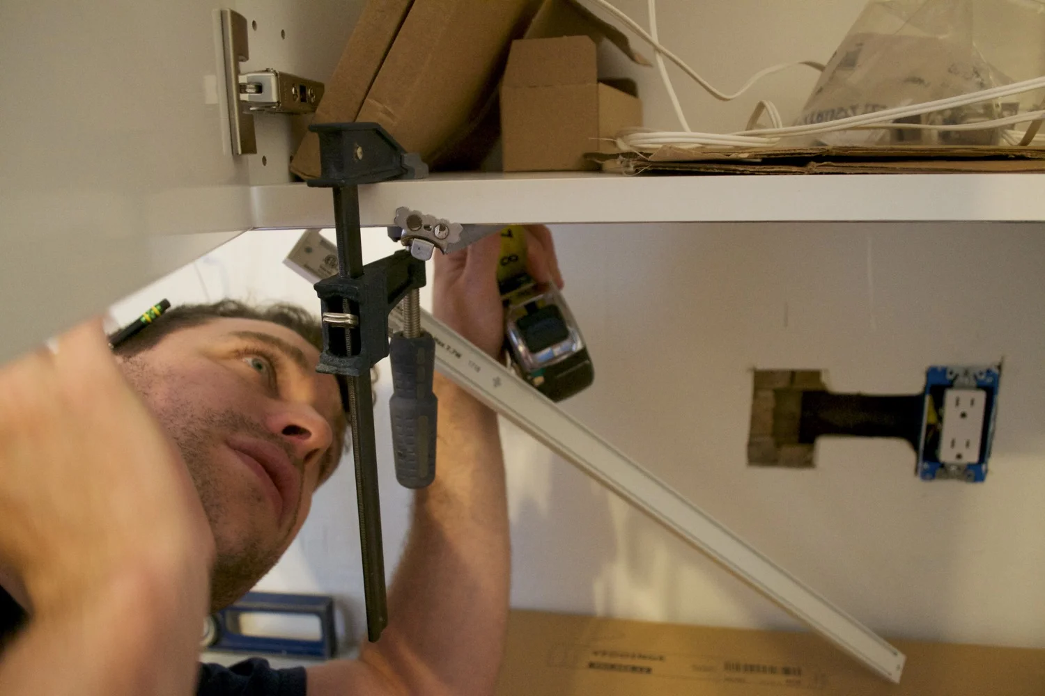 - When your cabinet is 24” or wider you have to use two lights mounted right next to each other to fill the space. We ran into trouble trying to get those lights to line up perfectly. If they’re off even a tiny bit you can really tell. We solved this (after several re-tries 🙃) by using a long ruler to draw a straight line across the entire width of both the cabinets. Just measure how far back you want the lights to be, make a little mark on each end, and then connect those two marks with the ruler. We found it to be much easier by clamping a long ruler to the cabinets to securely hold it in place. It’s surprisingly hard for one person to hold it in the correct position long enough for the other person to draw the line. And any little movements can mean you’re lights out of line with each other. This trick will ensure your line is straight and save you A LOT of trouble.